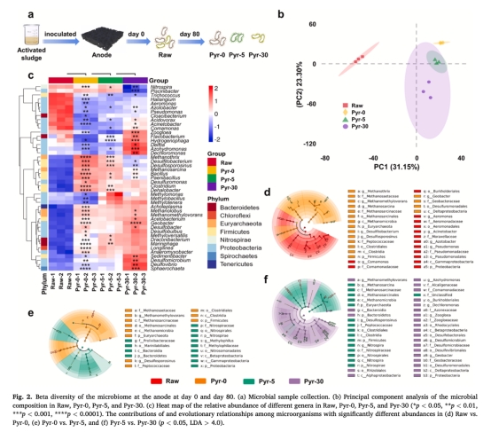 測量顯示高芘組(Pyr-30)pH下降滯后(圖1b),表明微生物有機質礦化活性受抑制,與TOC降解率降低(圖1c)和代謝組學中碳通路上調減弱(圖4a)相互驗證。
