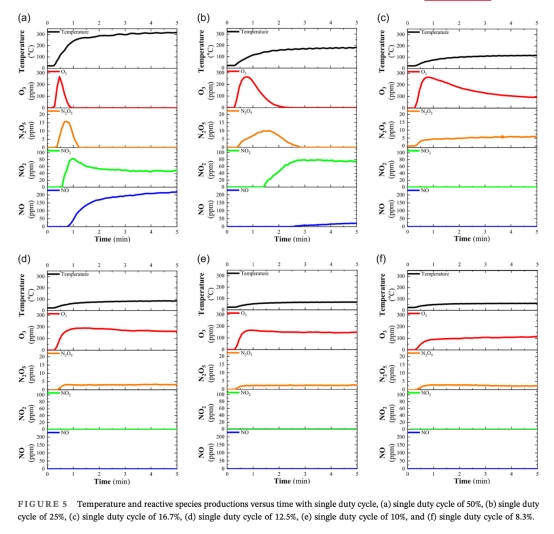 溫度數(shù)據(jù):SDBD表面溫度隨占空比線性升高(6°C/10%占空比,圖4b)。意義:量化溫度控制精度,關(guān)聯(lián)物種生成閾值(O?: <100°C, NO: >170°C)。來源圖4。