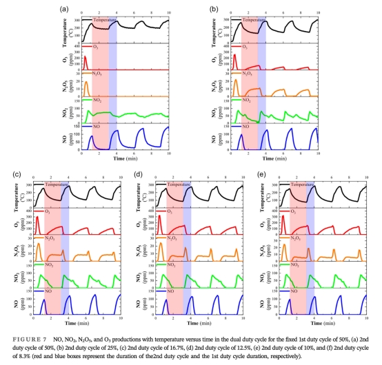 單占空比下,高溫模式(>170°C)促進(jìn)NO/NO?生成,低溫模式(<100°C)促進(jìn)O?/N?O?生成(圖5)。