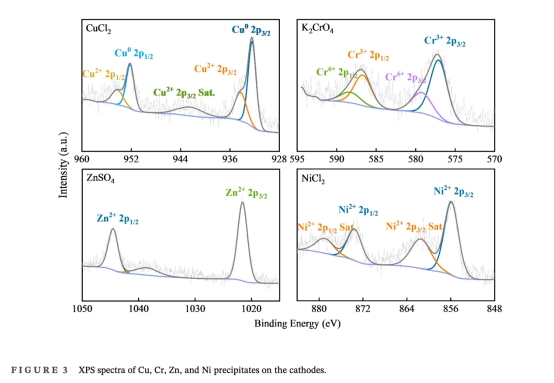陰極表面元素價態:XPS分析顯示Cu2?還原為Cu?(峰位932.4 eV),Cr??還原為Cr3?(峰位577.1 eV),而Ni2?/Zn2?未還原(圖3)。意義:證實氧化性重金屬通過陰極還原反應消耗電子引發電壓峰,解釋信號特異性機制。來源圖3。
