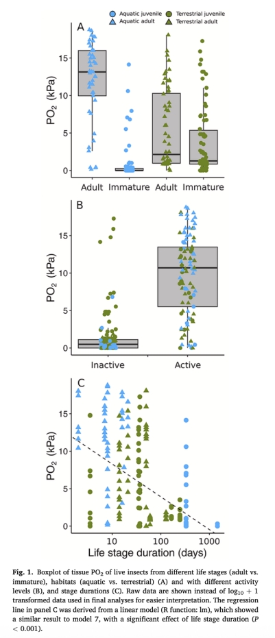 測量15種昆蟲(涵蓋9目)幼體和成體的組織氧分壓(PO?),發現顯著差異(0–18.8 kPa)。