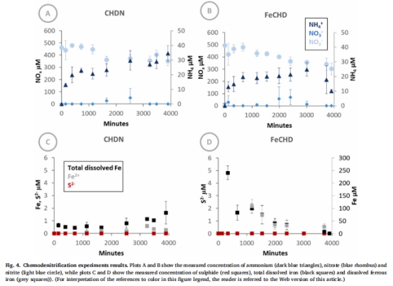 數據:∑S2?在表層沉積物實驗(sAMON)中積累(130 μM),深層(AMON)無積累(圖2C,D);Fe2?在反硝化/CDNT實驗中釋放(圖3C,D, 圖4C,D)。