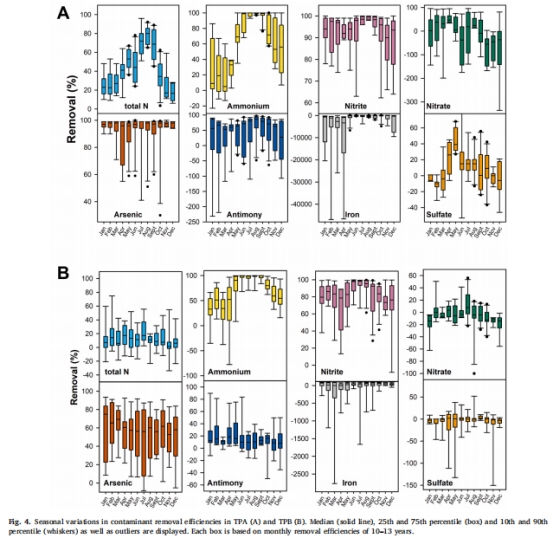 季節性差異:氮和硫酸鹽的去除效率夏季更高,而砷/銻的去除全年穩定(圖4)。
