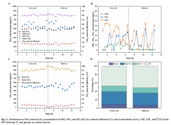 SO?去除:受NOx抑制后快速恢復(fù)(第18天:98.56%),證明系統(tǒng)適應(yīng)性(圖3C)。
