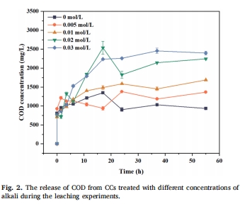 數(shù)據(jù):不同堿濃度處理的CC在55小時(shí)內(nèi)的COD累積釋放量(CC0.03最高:2397.94 mg/L)。