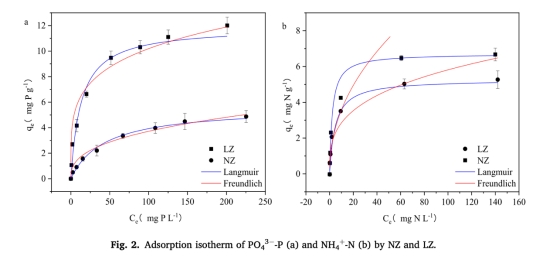 吸附等溫線數據(來自Fig. 2)。研究意義:量化NZ和LZ對PO4 3-P和NH4+-N的吸附能力(如LZ的最大PO4 3-P吸附量為11.16 mg/g),表明LZ的化學吸附機制更有效,支持LOZ在同時去除N和P中的應用潛力(Fig. 2a和2b顯示吸附量隨初始濃度增加)。