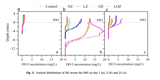 DO水平在沉積物-水界面的垂直分布(來自Fig. 5)。研究意義:使用丹麥Unisense微電極測量DO剖面(如第3天LOZ組氧滲透深度達12 mm),量化氧在沉積物中的擴散范圍和強度,表明氧補充促進了表層沉積物的好氧過程(如Fe(II)氧化)。