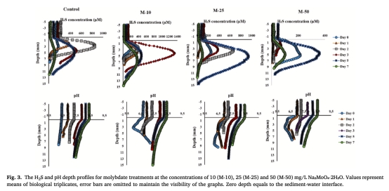 研究意義:量化H2S生產時空動態,顯示鉬酸鹽處理顯著降低水柱和沉積物H2S濃度(如M-50處理在沉積物-水界面減少73%),而硝酸鹽和過碳酸鈉僅臨時減少水柱H2S;這些數據直接驗證鉬酸鹽的抑制機制優于其他處理。