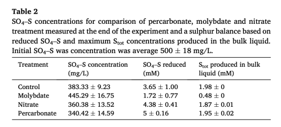 鉬酸鹽處理(50 mg/L Na2MoO4·2H2O)顯著抑制H2S生產,沉積物-水界面H2S減少73%,深層沉積物減少47%,并提高硫酸鹽殘留量16±4%,表明其通過抑制SRB活性有效控制硫化物源頭。