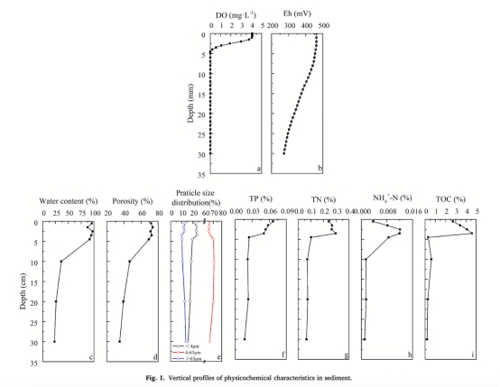 數(shù)據(jù)內(nèi)容:DO、Eh、pH、粒徑分布、TP、TN、NH??-N、TOC的垂向分布。