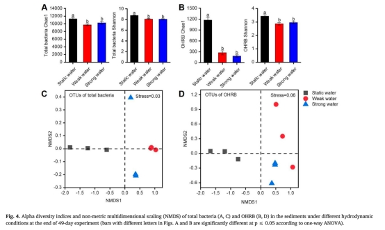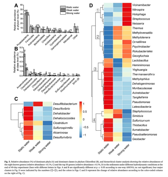 數據內容:動態水流降低細菌α多樣性(Chao1指數),且顯著改變群落組成(NMDS分析),如靜水組富集厭氧菌門(Chloroflexi >9%)、脫鹵球菌綱(Dehalococcoidia)。