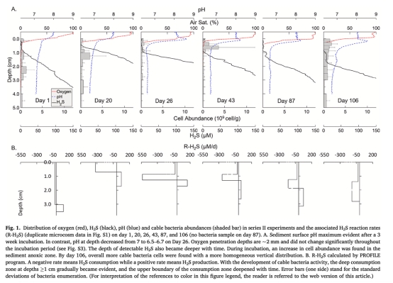測量數據:電纜細菌豐度垂直分布(AO染色/FISH技術)(來自圖1,3)。研究意義:量化菌絲密度(最高2840 m/cm2)及時空動態(初期富集亞表層0.25-1.5cm,后期向表底層擴散),關聯代謝活性變化。