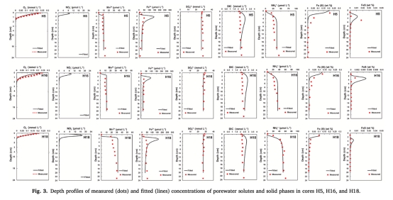 測(cè)量數(shù)據(jù):固相TOC含量及反應(yīng)性Fe(III)/Mn(IV)氧化物(來自圖3和圖5)。研究意義:TOC垂直分布(H5:1.55 wt% → H16/H18:0.68–0.72 wt%)反映OC礦化程度;Fe(III)/Mn(IV)含量(0.10–0.21 wt%)約束鐵/錳還原路徑的電子受體供應(yīng),支持模型對(duì)金屬還原速率的量化。