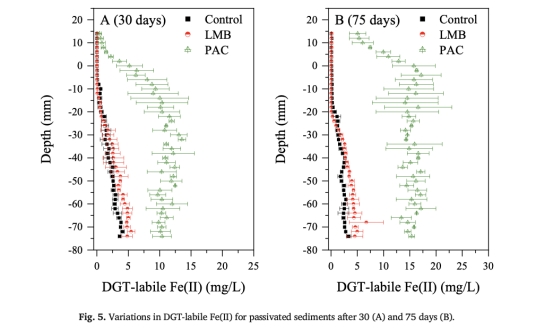 可溶性Fe(II)(圖4)與DGT活性Fe(圖5):同步監測溶解態和活性鐵。意義:揭示PAC引發全剖面Fe(II)劇增(pH降低促進解吸),直接驅動磷釋放(圖2中層通量升高)。