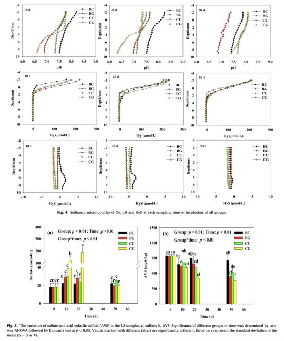 CG組亞氧區(qū)pH顯著降低(pH最低7.2),O?快速耗竭(<1 mm深度),硫酸鹽濃度劇增(18→212 mmol/L)。