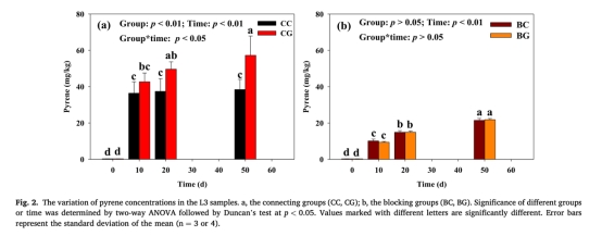 CG組L3層芘濃度(42.7-57.3 mg/kg)顯著高于CC組(36.4-38.4 mg/kg),證實(shí)微生物遷移主導(dǎo)芘的深層運(yùn)輸。