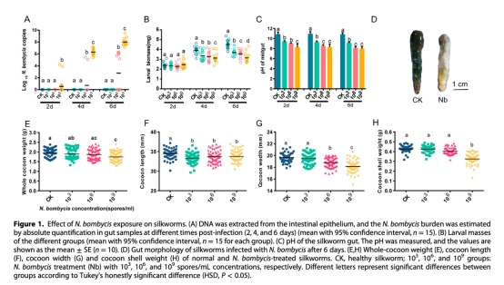 數據:孢子數量(qPCR)、幼蟲體重、腸道pH、繭性狀(全繭重、繭長、繭寬、繭層重)。