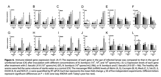 本研究基于家蠶-微孢子蟲模型,發現家蠶對微孢子蟲Nosema bombycis(Nb)感染的敏感性具有劑量和時間依賴性。感染后家蠶腸道菌群中厚壁菌門(Firmicutes)的腸球菌屬(Enterococcus)豐度顯著增加。從家蠶腸道分離的糞腸球菌LX10(E. faecalis LX10)在體外和體內均能降低Nb孢子萌發率和感染效率,并通過組織病理學驗證。LX10與Nb共處理后,家蠶免疫基因(Akirin、Cecropin A、Mesh、Ssk、DUOX、NOS)表達、過氧化氫(H?O?)和一氧化氮(NO)水平及谷胱甘肽S-轉移酶(GST)活性均得到恢復。通過LC-MS/MS鑒定出抑菌蛋白enterococcin LX。結果表明,LX10通過直接抑制Nb和調節宿主免疫,在家蠶抵御微孢子蟲感染中發揮關鍵作用。