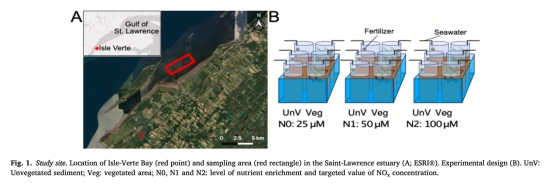 采集加拿大圣勞倫斯河口沉積物核心(含/不含海草),設置3個營養水平(N0: 背景值;N1: 2倍;N2: 4倍)和2個季節(5月/8月)。