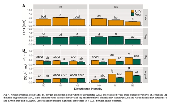 通過微電極(OX-100)以100μm步長測量沉積物氧梯度(圖4A),發現營養鹽富集使氧化層(OPD)從8.4mm(N0)壓縮至1.4mm(N2),直接證明有機質礦化耗氧量增加。