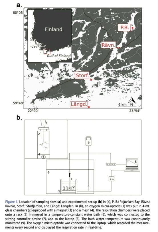 本研究通過沿芬蘭灣西部自然鹽度梯度(鹽度3-7)測量常見橈足類Eurytemora affinis的耗氧量,探究鹽度降低對橈足類代謝的影響。結果顯示,鹽度降低顯著增加橈足類的呼吸速率(耗氧量),表明低鹽環境對其造成生理脅迫。這一現象可能由氣候變化導致的淡水輸入增加引起,未來鹽度持續下降將提高橈足類能量需求,進而影響波羅的海等河口生態系統的食物網結構(如鯡魚和鯖魚的食物質量)。