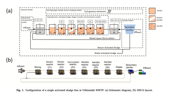 論文摘要提出了一種基于擴展活性污泥模型(ASM2d-N?O)的方法,用于識別污水處理廠(WWTP)中N?O排放的主要路徑。研究通過校準和驗證模型,在芬蘭Viikinm?ki污水處理廠進行應用,發現異養反硝化(DHET)是N?O主要產生途徑,但同時是重要的消耗途徑;好氧區貢獻93%的N?O總排放量。排放因子(EF)為0.94%(進水總氮負荷),顯著低于IPCC默認值(1.6%),模型應用可減少年碳排放952噸CO?當量。