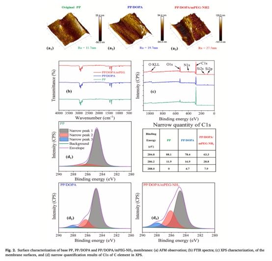 元素組成:PP/DOPA/mPEG-NH?膜N元素增至2.3%(圖2c-d)