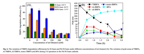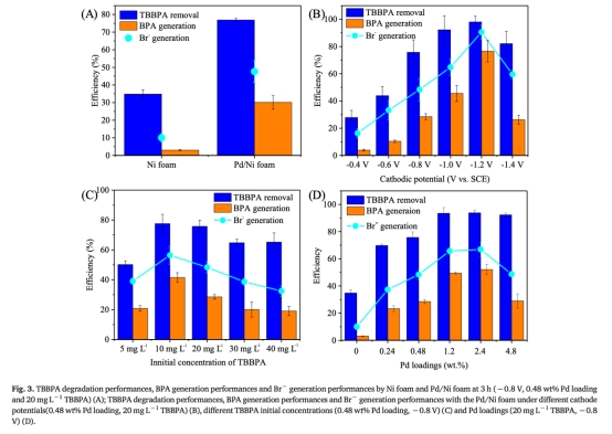 開(kāi)發(fā)高效電化學(xué)還原系統(tǒng),解決TBBPA(持久性溴代阻燃劑)在水環(huán)境中的深度去除難題,闡明Pd/Ni foam電極的催化機(jī)制與優(yōu)化策略。