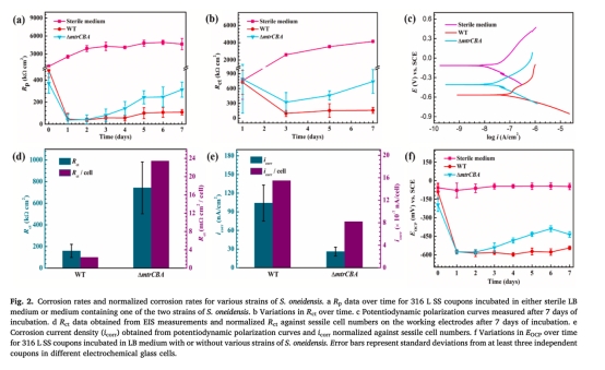 闡明好氧環境中S. oneidensis加速不銹鋼腐蝕的分子機制,驗證直接微生物電子攝取(而非傳統電子媒介)是主導途徑。