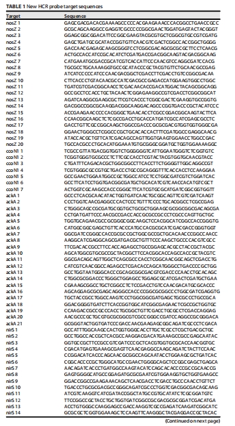 設計ccoN1(細胞色素c氧化酶)、narG(硝酸鹽還原酶)、nirS(亞硝酸鹽還原酶)、nosZ(氧化亞氮還原酶)、ackA(乙酸激酶)的HCR探針(表1);
