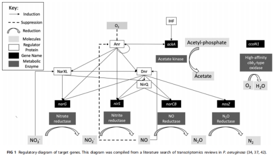 支持反硝化基因受Anr/Dnr轉錄因子級聯調控的模型(圖1)。