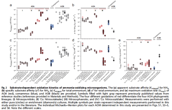 高親和力組(Km(app)≤0.025 μM):Nitrosopumilales(如海洋菌N. maritimus);