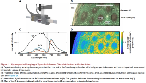 研究通過高光譜成像(圖1)和氧敏感粒子示蹤技術(sensPIV)(圖2)首次揭示珊瑚(Porites lutea)表面纖毛渦流對光合產氧的主動調控機制:
