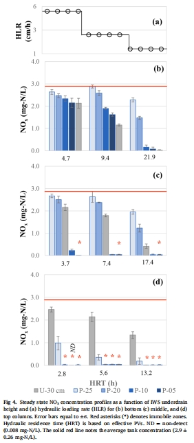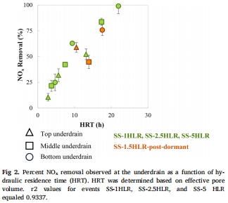 穩(wěn)態(tài)流條件:脫氮效率與水力停留時(shí)間(HRT)呈正線性關(guān)系(R2=0.93),底部排水口在HLR=1 cm/h時(shí)脫氮率達(dá)99%(圖2)