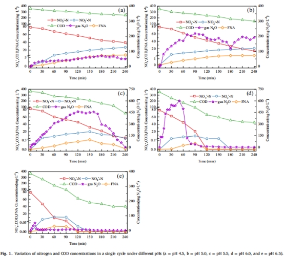圖1:不同pH下氮/COD濃度變化 → N?O產(chǎn)率與亞硝酸鹽積累關(guān)系
