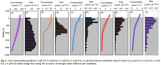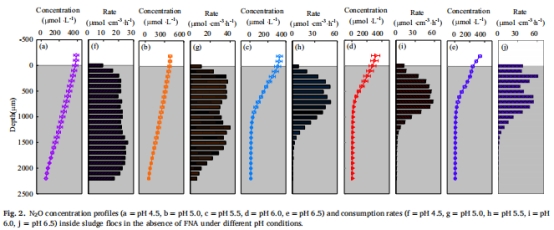 有FNA時(shí)N?O生成速率 圖5f–j FNA存在進(jìn)一步刺激生成速率(pH4.5時(shí)比無(wú)FNA高8.4%),增加底物效應(yīng)。