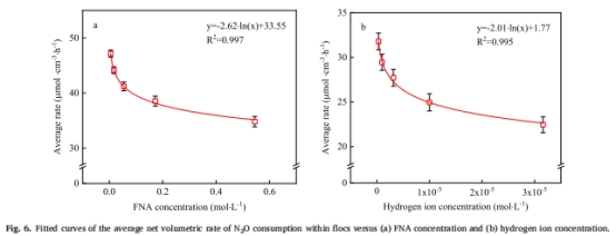FNA存在時(shí),N?O消耗速率進(jìn)一步降低(pH4.5: 34.82 vs. 22.45 μmol·cm?3·h?1),但通過(guò)圖6擬合曲線明確FNA僅協(xié)同放大H?的抑制效果。