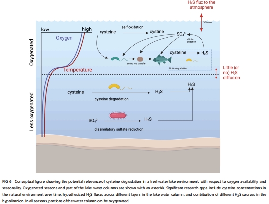 摘要指出:在富氧淡水環境中,細菌可通過降解含硫氨基酸(如半胱氨酸)產生硫化氫(H?S)。傳統觀點認為H?S主要源自厭氧環境(如沉積物),但本研究通過分離菌株、生理實驗和基因組分析,證實了多種好氧淡水細菌(變形菌門、擬桿菌門、放線菌門)可在有氧條件下降解半胱氨酸并釋放H?S。結合5年宏基因組時間序列數據(威斯康星州門多塔湖),進一步證明此類菌株及半胱氨酸降解基因在自然水體中廣泛存在,提示有氧H?S生產是淡水硫循環中被忽視的過程。