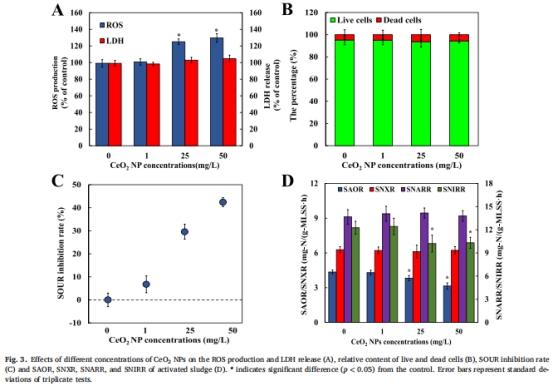 反應器性能:在SBR中測試不同濃度CeO? NPs(0、1、25、50 mg/L)對氮轉化及N?O排放的動態影響(圖1)。