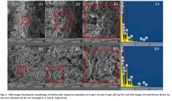 SEM-EDS顯示5 mg/L組生物膜表面被Ag-NPs覆蓋,孔隙堵塞(圖3B)。