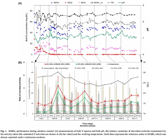 NOB抑制機制:間歇曝氣通過提升pH和游離氨(FA)濃度(pH升至7.52,FA達1.17 mg-N/L),選擇性抑制NOB活性(活性降低80%),促進亞硝酸鹽積累(圖1B)。
