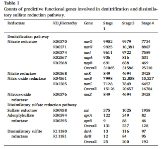 | 功能基因豐度 | PICRUSt預測(KEGG) | 表1 | 解釋代謝途徑變化:硝酸鹽還原酶基因(*narGHI*)減少,硫酸鹽還原酶基因(*sat*)增加(3.3.3節)。