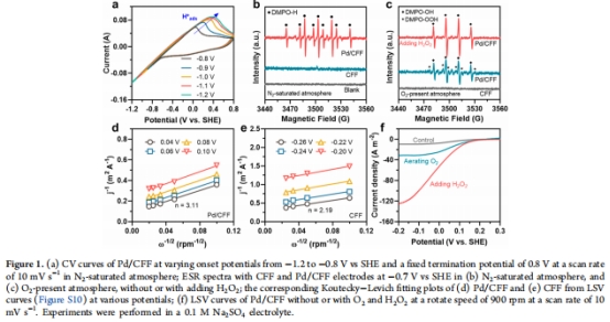 CV和ESR證實Pd陰極生成H*并介導O?→H?O?→?OH路徑(圖1)。