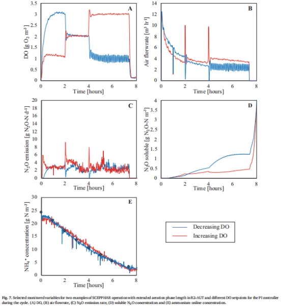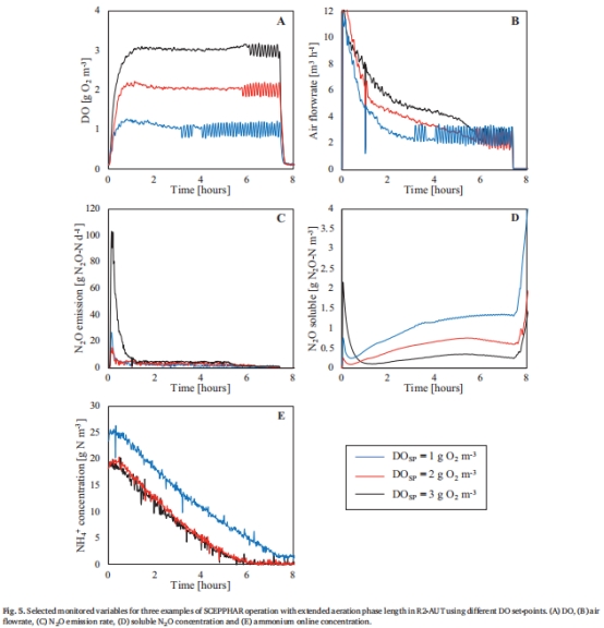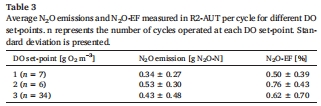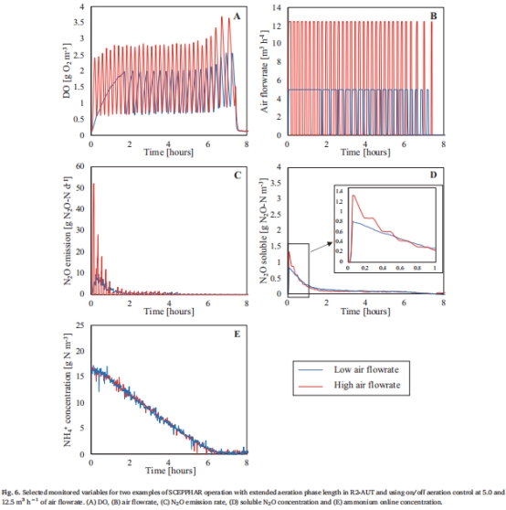 曝氣策略影響:間歇曝氣使R2-AUT反應器的N?O排放降低40%(圖6),而溶解氧(DO)設定值(1–3 g O?/m3)對N?O排放無顯著影響(表3)。