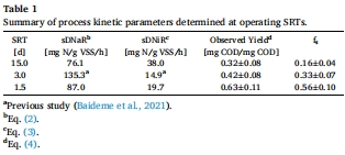 短SRT(1.5天)觀測產率(Y)最高(0.63 mg-COD/mg-COD)。