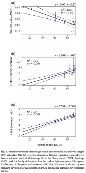 生態系統響應:污染河段的大型無脊椎動物群落氧調節能力(WAR)與最小DO飽和度顯著負相關(R2=0.69, p<0.001;圖5a),生物多樣性(EPTCO豐富度)和耐污指數(ASPT)同步下降(R2≥0.79;圖5b-c)。
