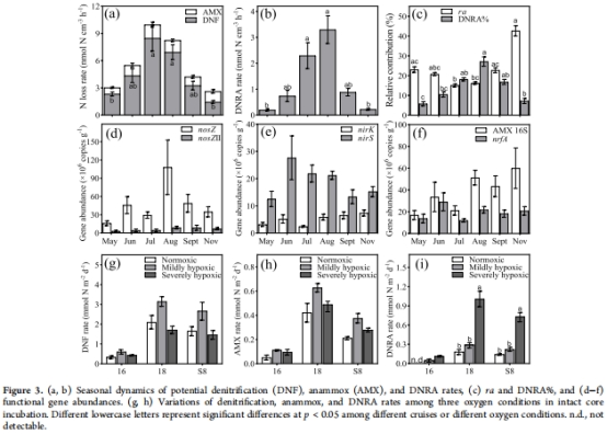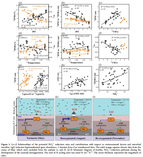 闡明脫氧對(duì)硝酸鹽還原路徑的影響:量化季節(jié)性脫氧期間反硝化、厭氧氨氧化和DNRA的參與度與動(dòng)態(tài)變化。