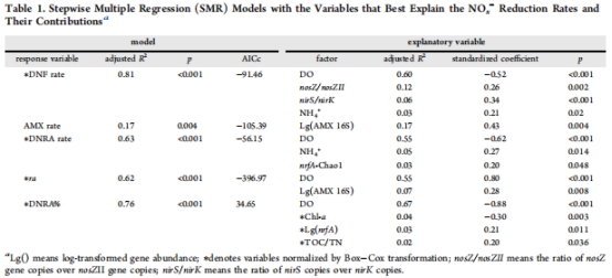 數(shù)據(jù):SMR模型顯示DO解釋反硝化速率變異的54%(表1);反硝化速率與Chl-a正相關(guān)(r=0.81, p<0.01),DNRA%與溫度正相關(guān)(r=0.62, p<0.01)(圖5c-e)。
