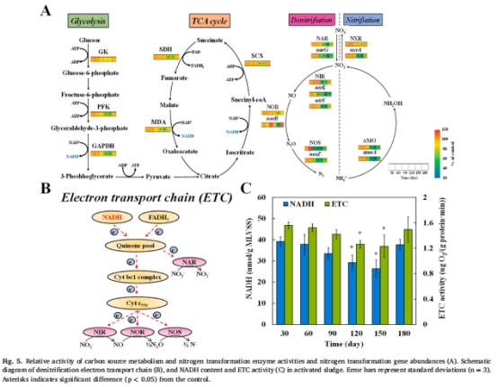 分子機(jī)制:nano-TiO?抑制碳源代謝(GAPDH、MDA酶活性↓)、電子傳遞鏈(ETC活性↓)及反硝化酶(NOS活性↓),導(dǎo)致電子競爭失衡(圖5)。