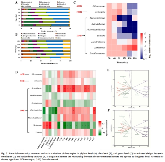 批次實(shí)驗(yàn)顯示:異養(yǎng)反硝化對N?O貢獻(xiàn)從37.6%(對照)↑至47.7%(50 mg/L,圖4B)。